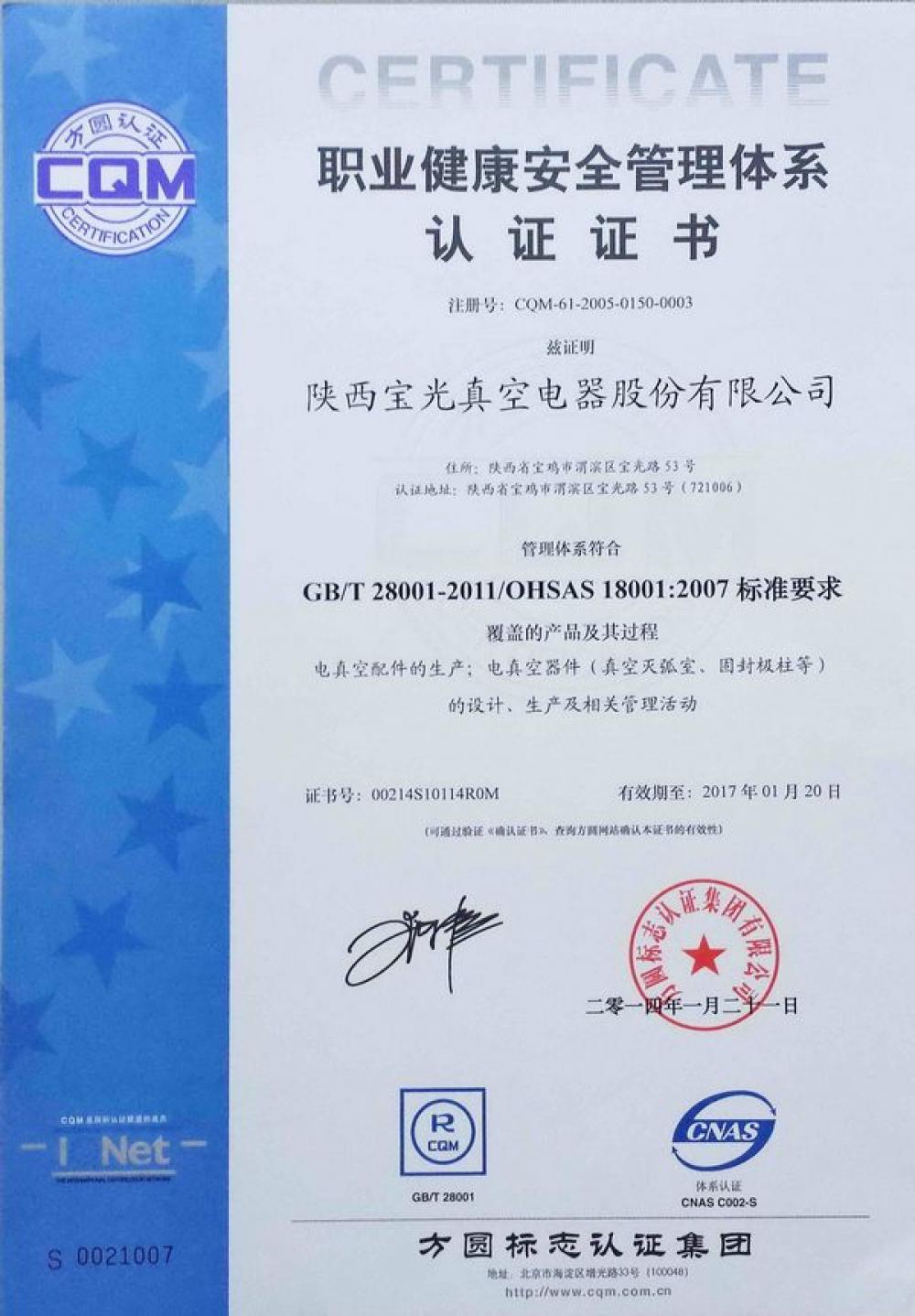 In 2014, Shaanxi Baoguang obtained OHSAS 18001:2007 Occupational Health and Safety Management System certificate.