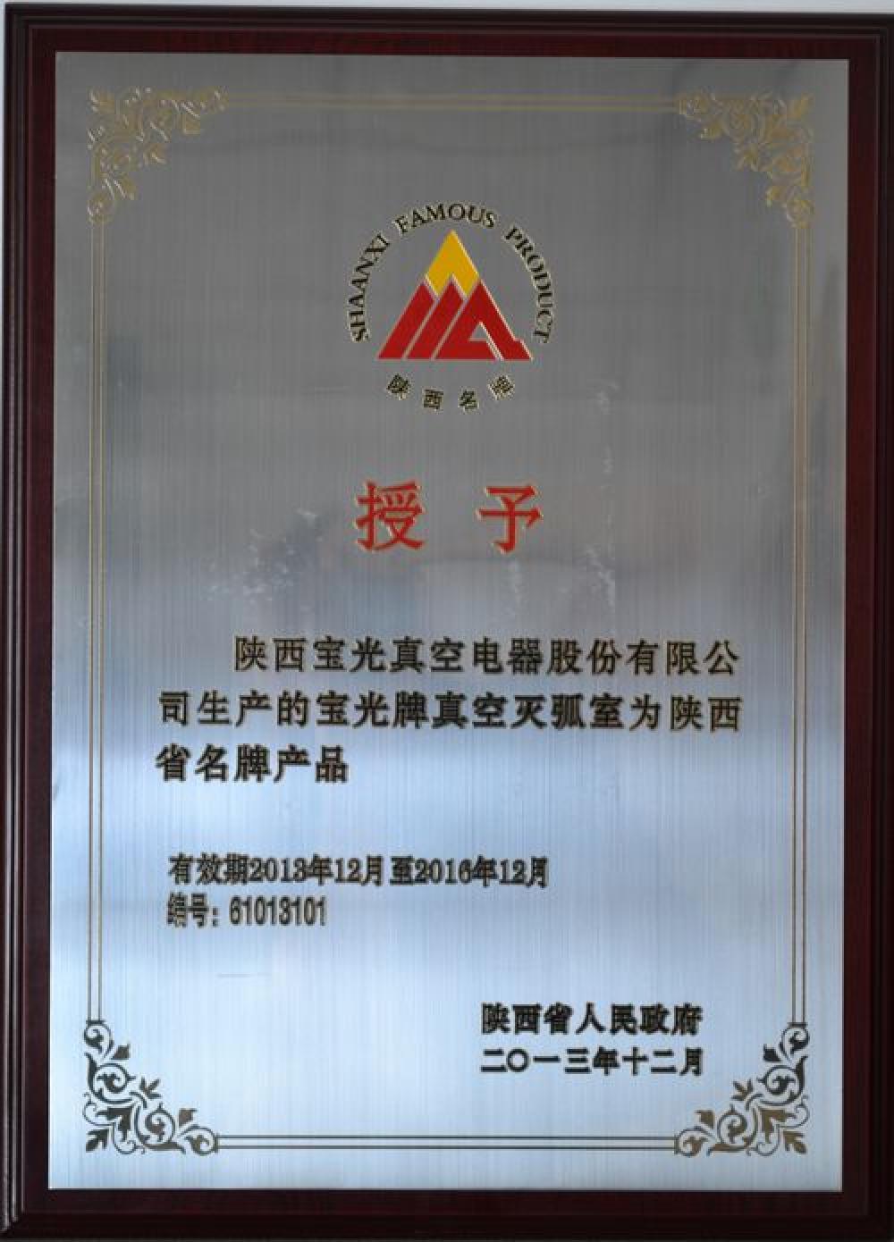 Baoguang vacuum interrupter was awarded as Shaanxi Famous-Brand Product.