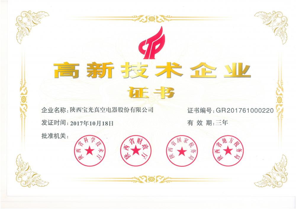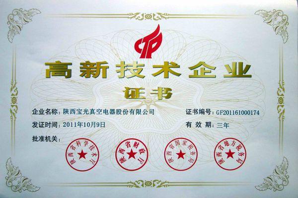 In October 2011, Shaanxi Baoguang obtained High-Tech Enterprise Certificate of Shaanxi Province.