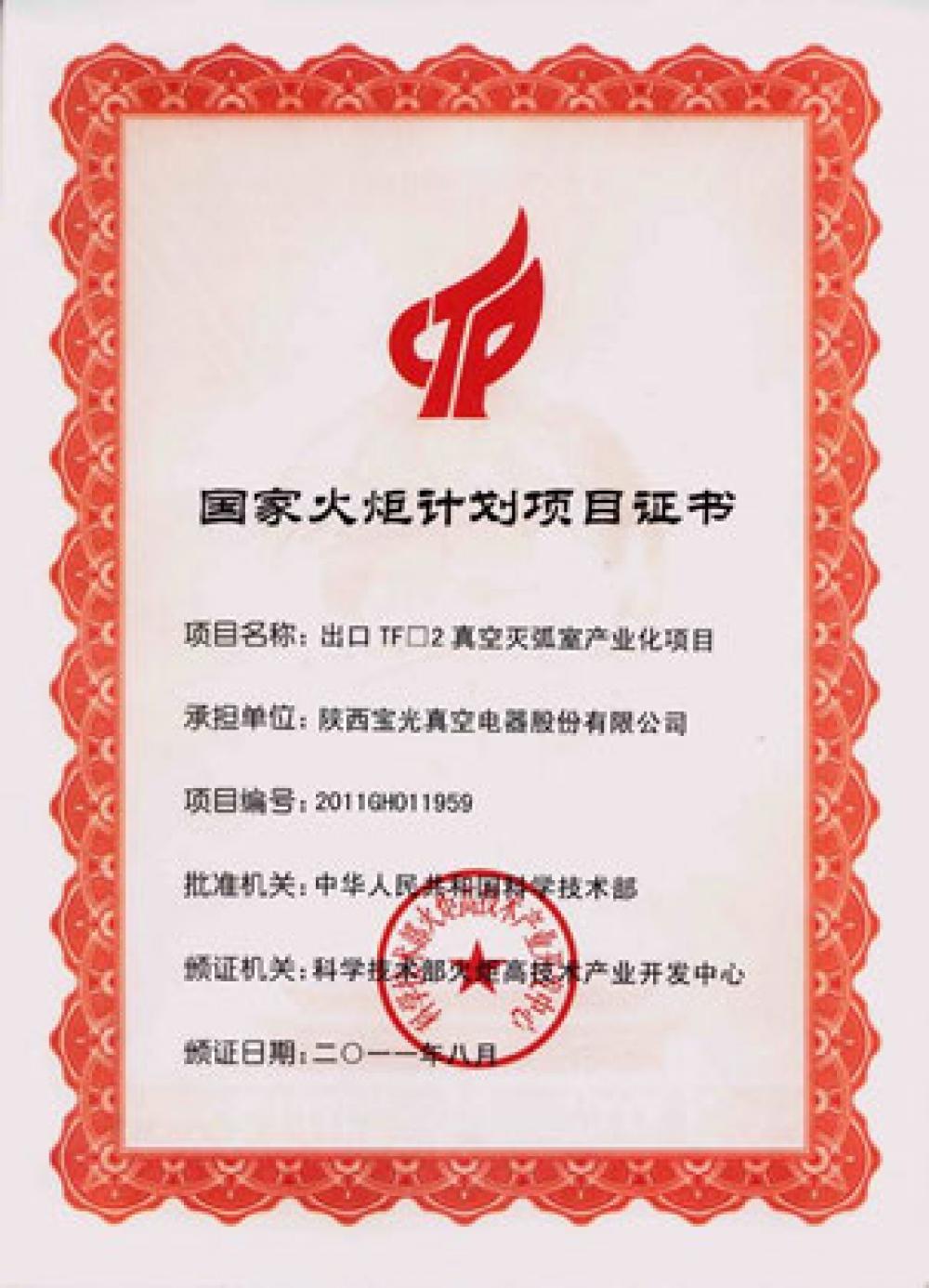 In 2011, TF2 vacuum interrupter for export was listed in the National Torch Program Project.