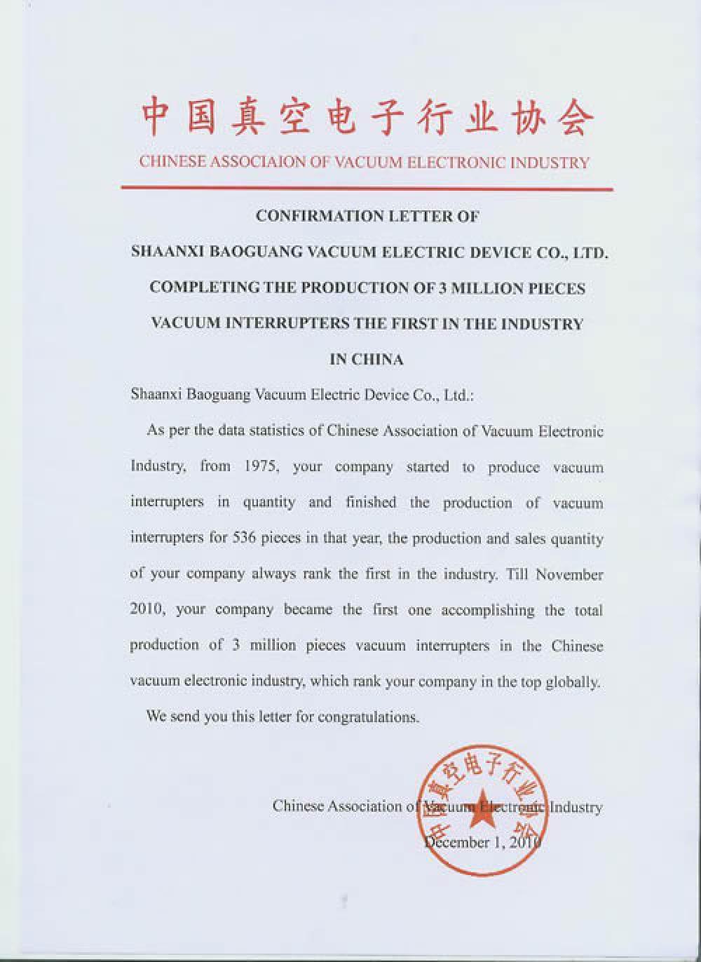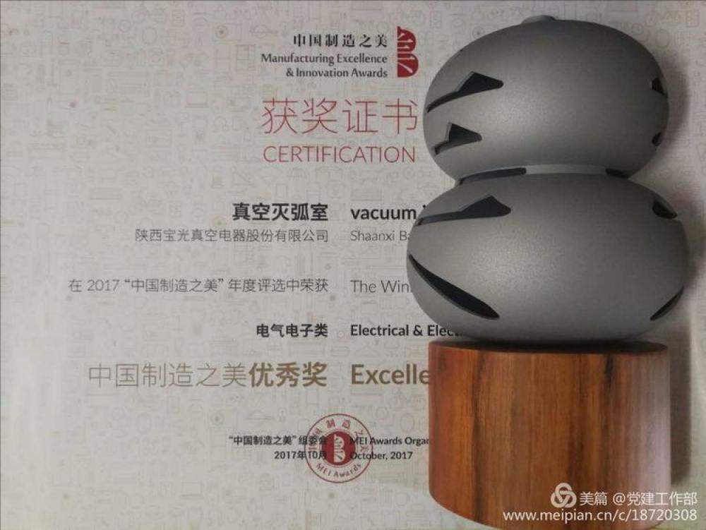 In 2017,Baoguang vacuum interrupter won MEI Awards (Manufacturing Excellence & Innovation Awards)-Electrical & Electronics-Excellence Award.