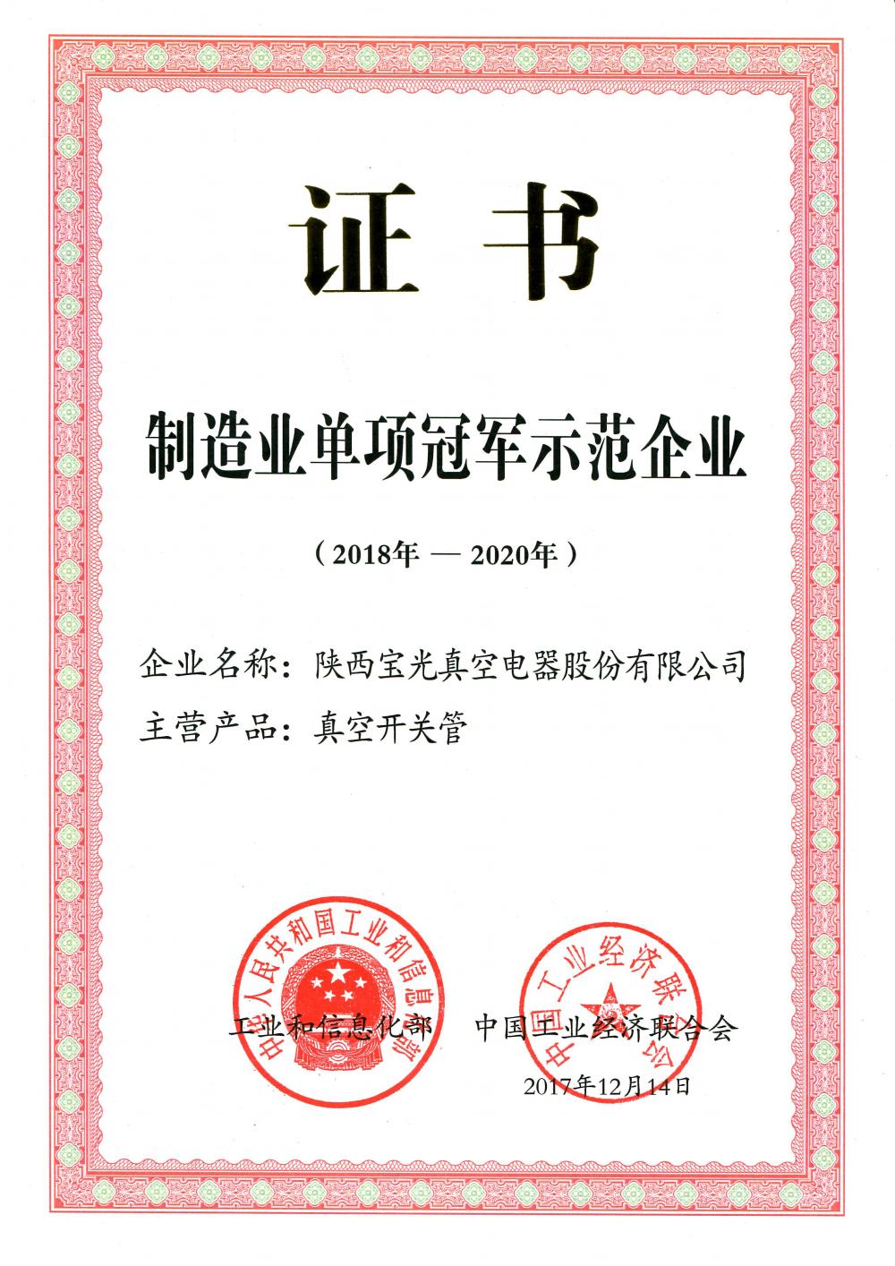 in 2017,A Single Champion Model Enterprise in Manufacturing Industry.