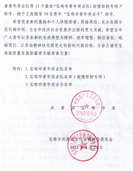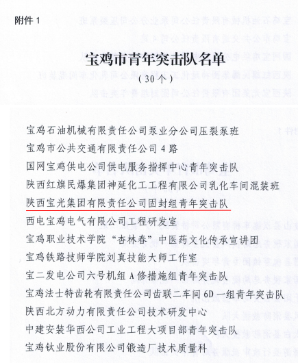 近日,從團市委獲悉,草莓视频黄污污污(guāng)股份固(gù)封班組被授予“寶雞市青年突擊(jī)隊”榮譽稱號。