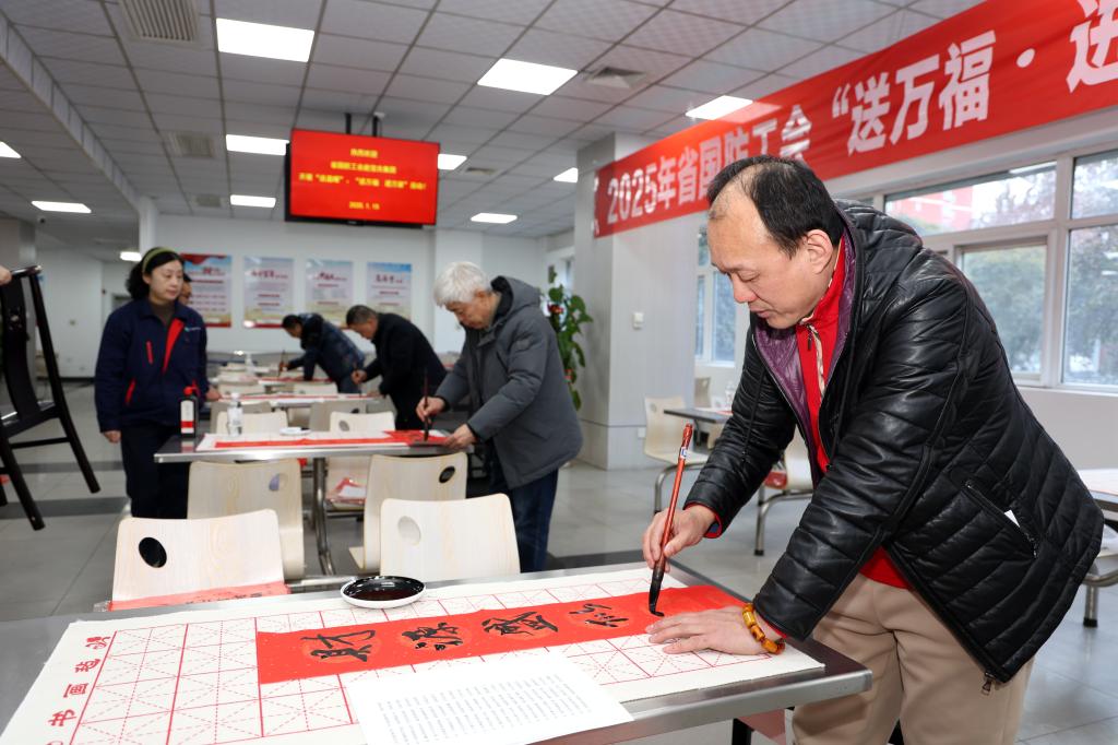 國防工會靳海斌副主席致(zhì)辭,他表示“送溫暖(nuǎn)”“送萬福·進萬家(jiā)”是工會組織在重大節日向廣大職工(gōng)送溫暖的重要內容,福文化是(shì)中華民族的重要組成部分,是(shì)中華文化的價值理想和根本歸(guī)宿。今天邀請國防係統(tǒng)7位著(zhe)名書法(fǎ)家為大家送春聯寫“福”字,用書香筆墨為職工朋友(yǒu)們送去新春的(de)祝福和(hé)美(měi)好祝願,也希望通過這種廣大職工喜聞樂見的形式切實把黨的關懷和(hé)溫暖送到廣大職工身邊,激發廣大(dà)職工的勞動熱情(qíng)和創造熱情,增強實現中華民(mín)族偉大複興(xìng)的精神力量。
