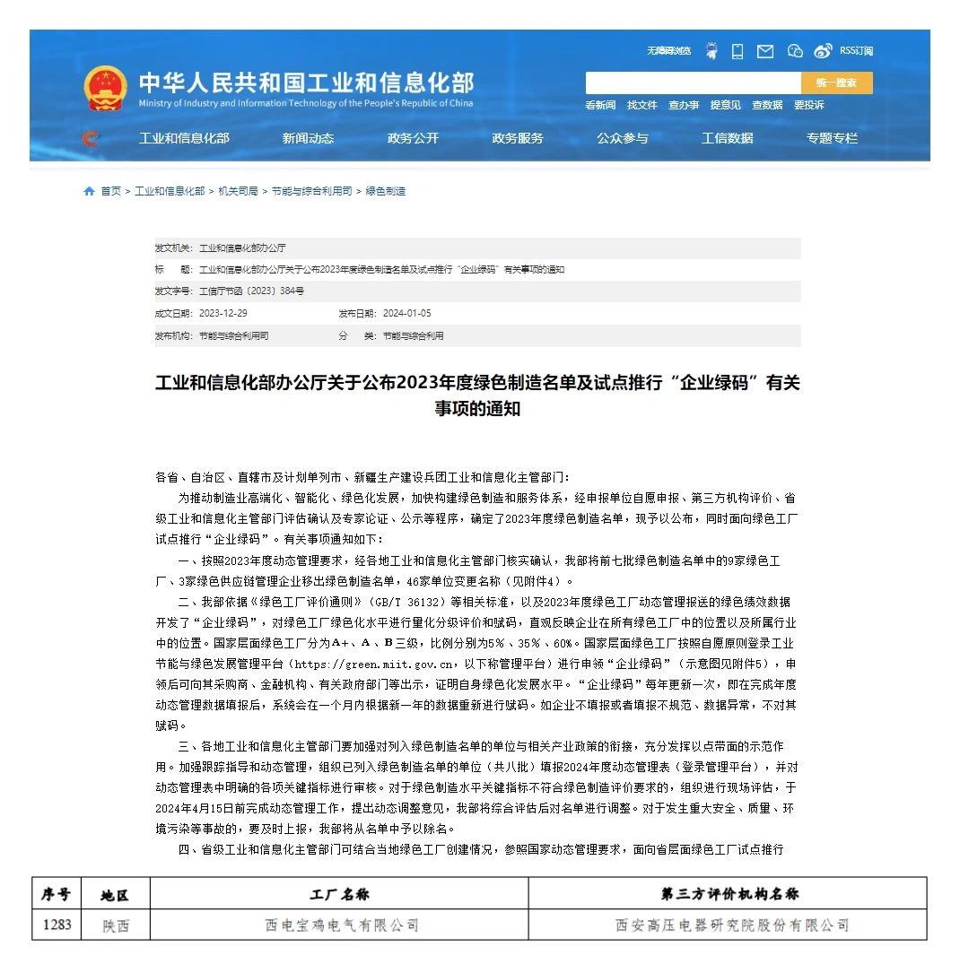 近(jìn)期,國家工業和信息化部公示2023年度綠色工(gōng)廠名單,中國西電集團所屬西電寶雞電氣(qì)成功入選。