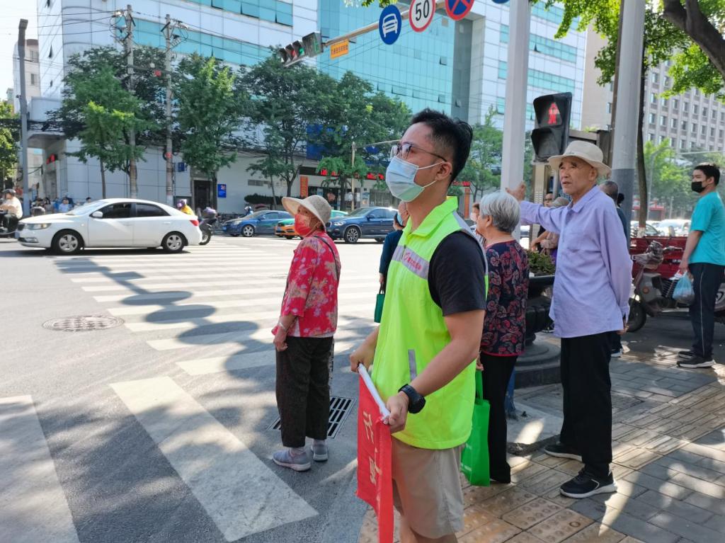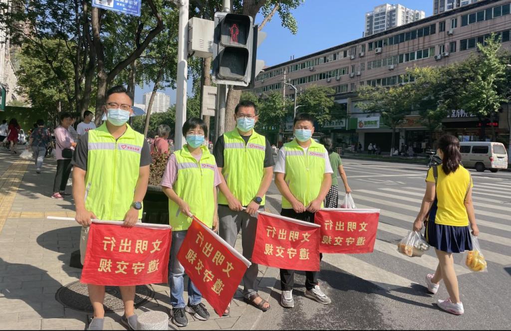 頂著炎炎烈日,誌願(yuàn)者身穿(chuān)“黃馬甲(jiǎ)”站在峪泉路和公園路十(shí)字路口,及時對行人(rén)和非機動車橫穿馬路、亂闖紅燈等不文(wén)明交通行為進行勸導,引(yǐn)導其遵章守紀、文明(míng)出行,同時(shí)還耐心熱情地為需要幫(bāng)助的行人指路,以(yǐ)實際行動傳遞(dì)社會正能量(liàng)和新時代文明新風尚。